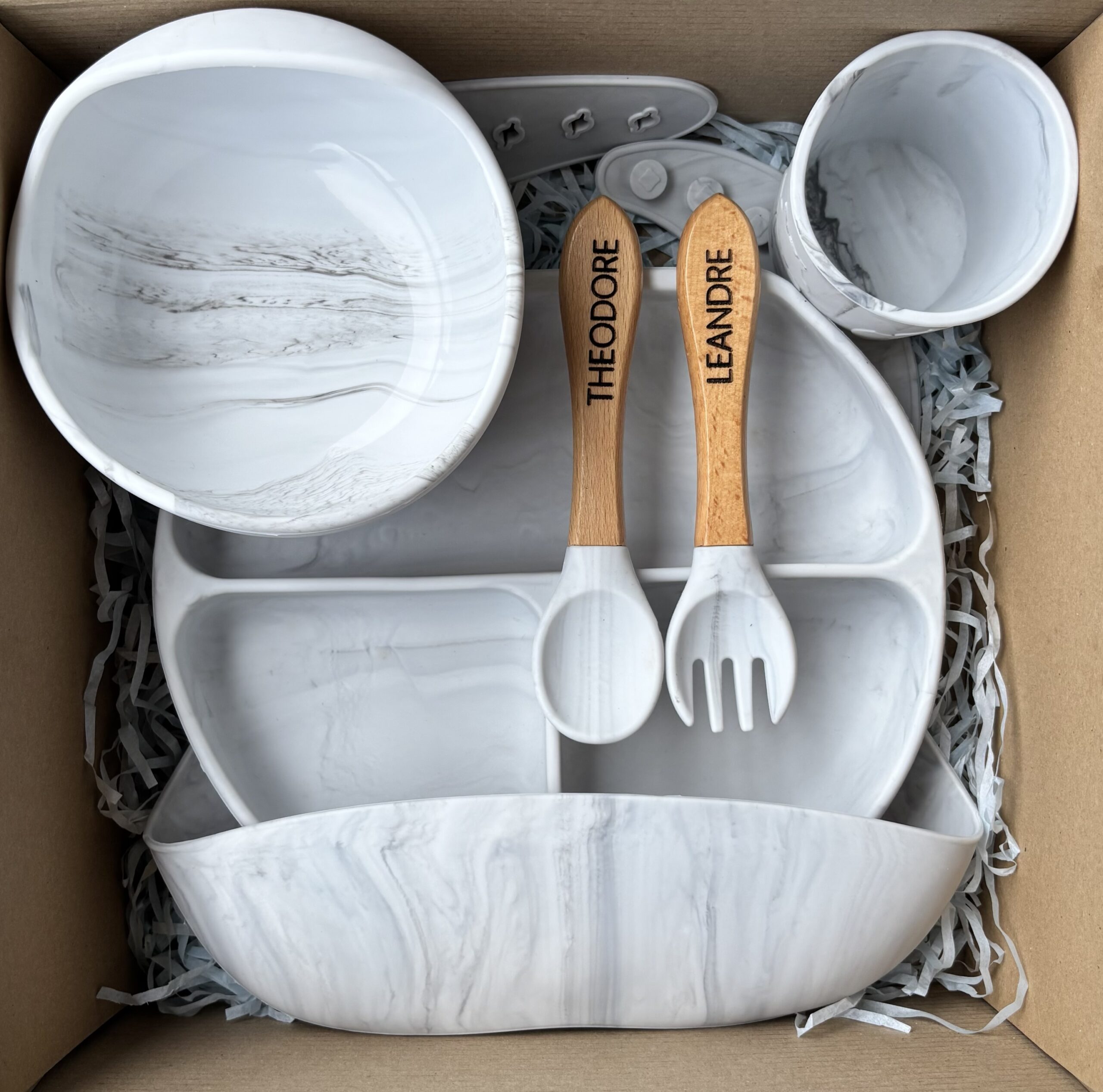 The perfect bundle for your growing baby, our weaning set has everything your baby needs for mealtime. This luxury baby feeding set comes with an adjustable silicone bib with pocket, a plate, a bowl and utensils.