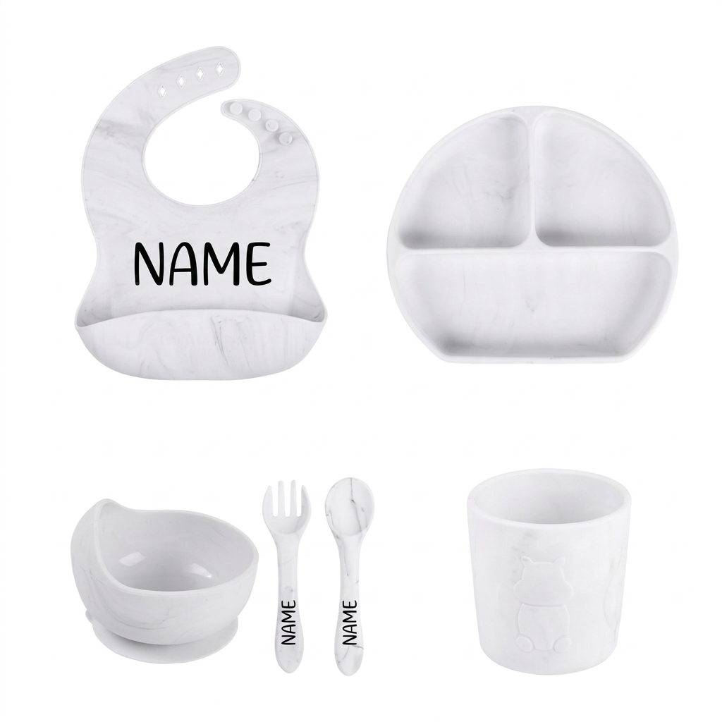 The perfect bundle for your growing baby, our weaning set has everything your baby needs for mealtime. This luxury baby feeding set comes with an adjustable silicone bib with pocket, a plate, a bowl and utensils.