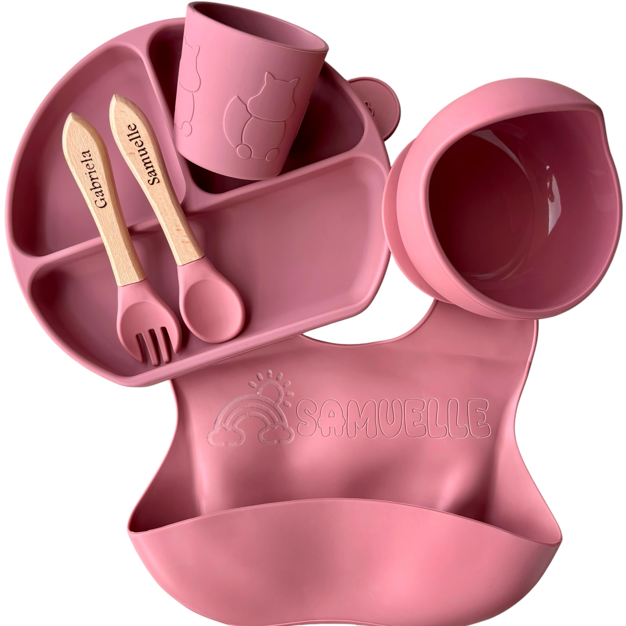 The perfect bundle for your growing baby, our weaning set has everything your baby needs for mealtime. This luxury baby feeding set comes with an adjustable silicone bib with pocket, a plate, a bowl and utensils.