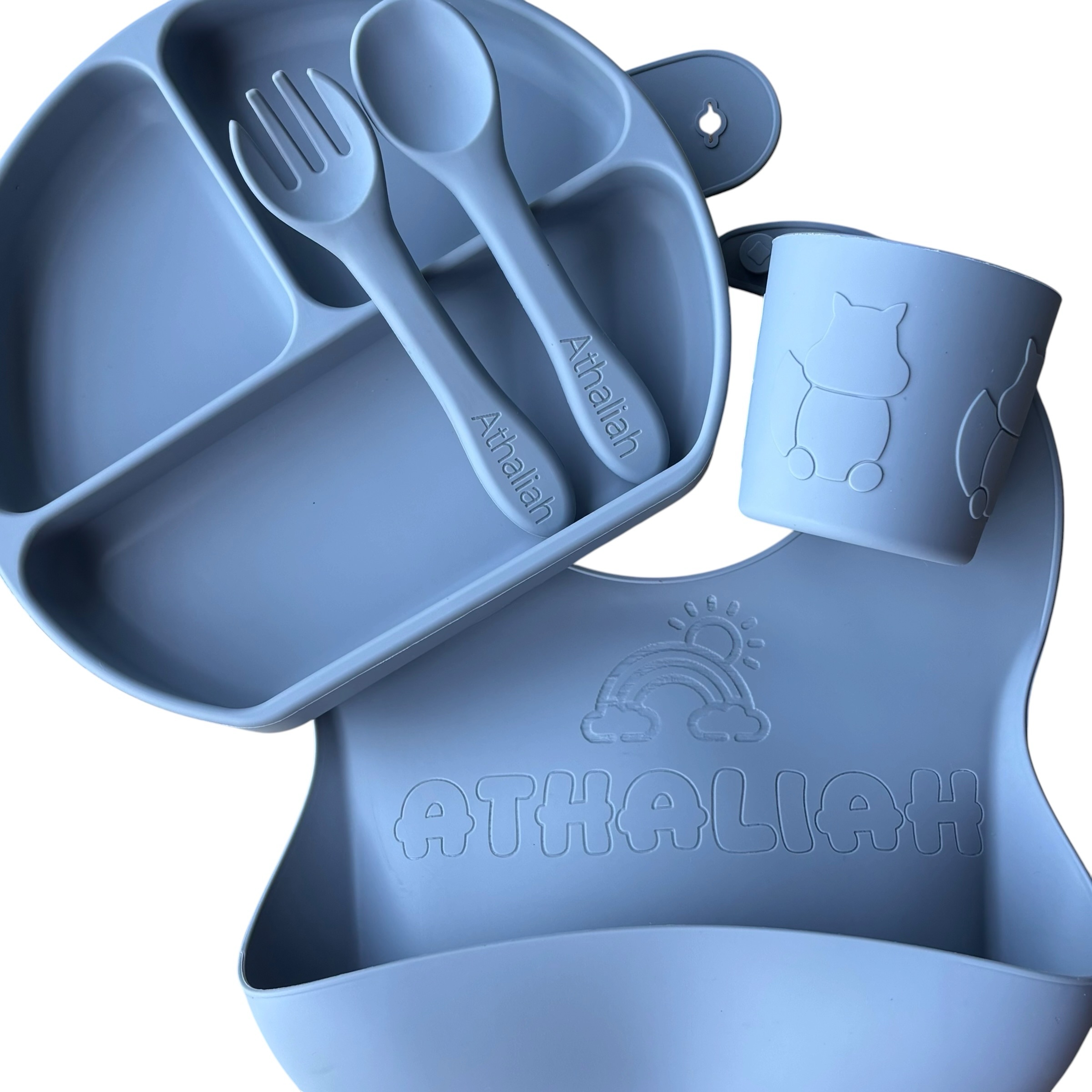 The perfect bundle for your growing baby, our weaning set has everything your baby needs for mealtime. This luxury baby feeding set comes with an adjustable silicone bib with pocket, a plate, a bowl and utensils.